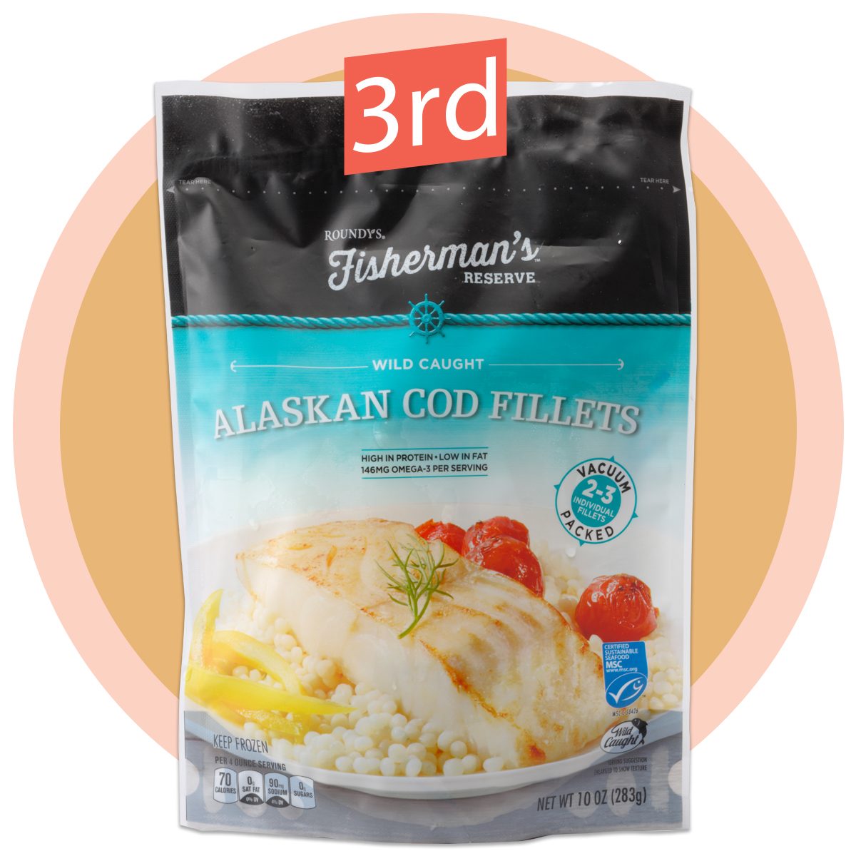Another great option for frozen fish came from Kroger’s exclusive seafood brand. This frozen cod was fairly substantial with its thicker cuts and firm texture. Just like our other top brands, there was no unpleasant fishy flavor—just good white fish.