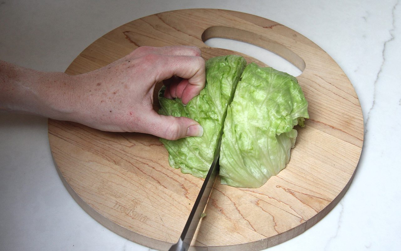 Use a chef’s knife or cleaver to cut the lettuce head in half.