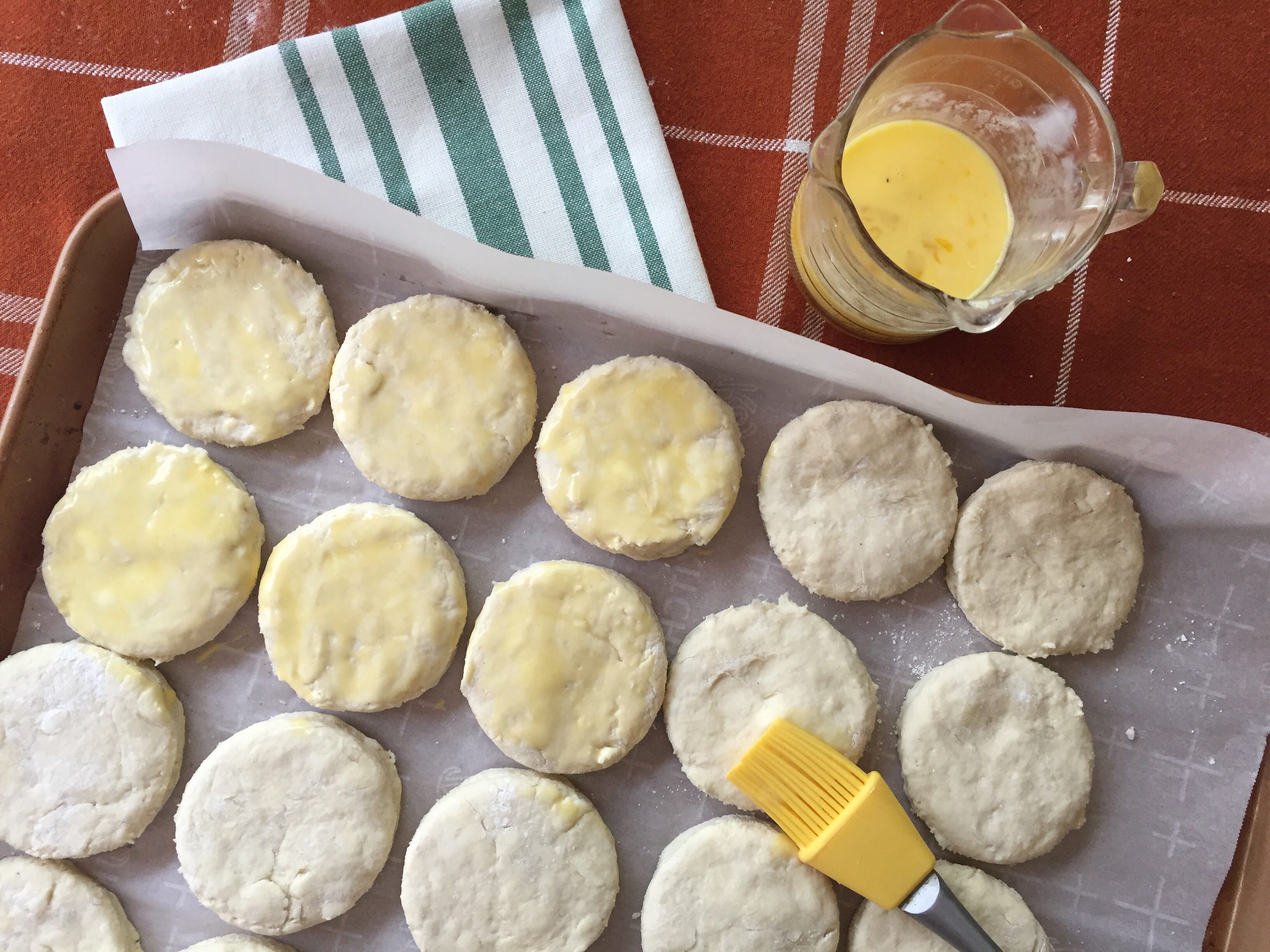 Then I popped these all onto a baking sheet lined with parchment paper. Joanna writes that these should all be touching one another as they go into the oven. She explains this is what helps keep them light and moist. I wasn’t going to argue with that, so I lined them up according to the directions. Then I whisked together an egg with a tablespoon of buttermilk and brushed it over the top of each biscuit.