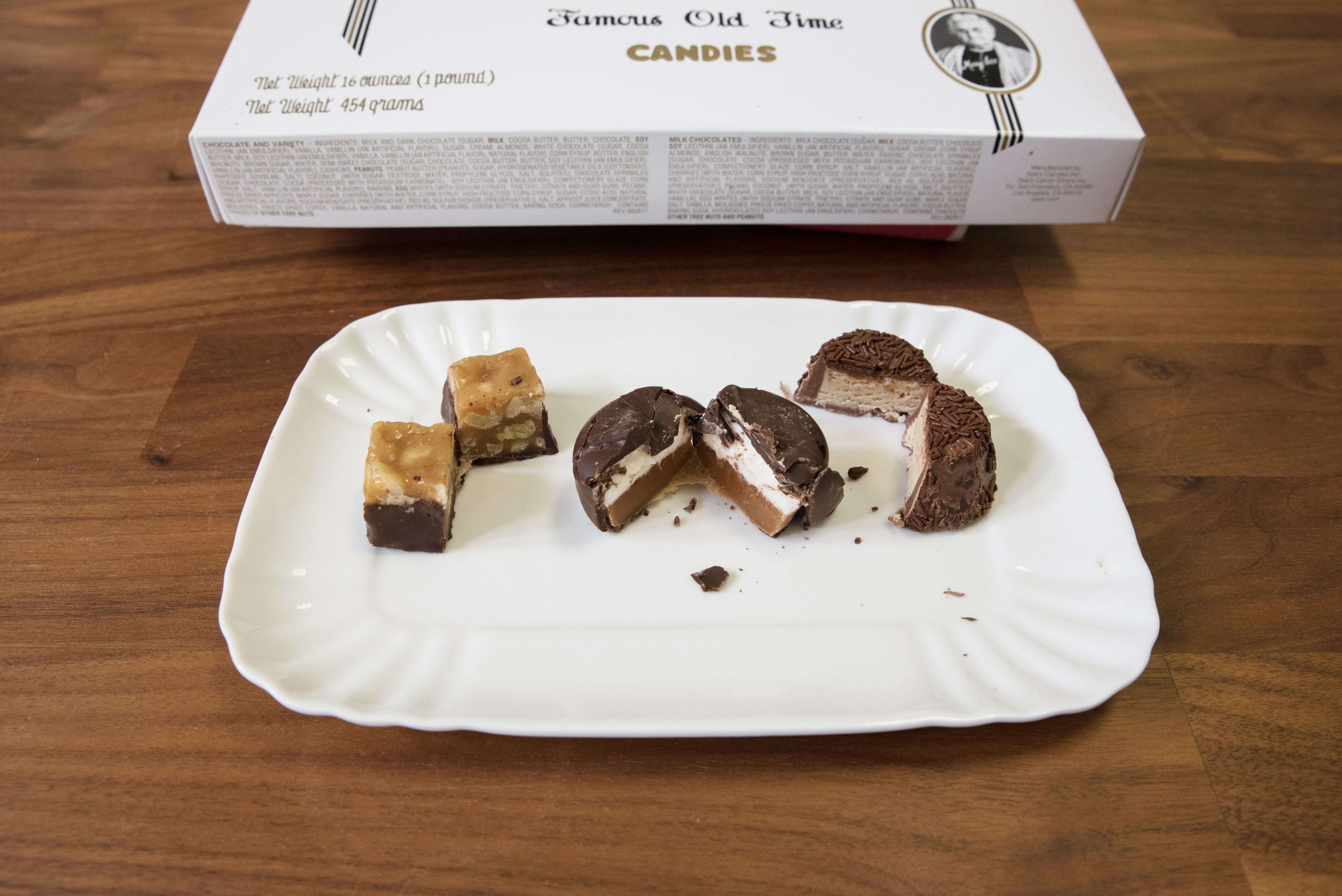 Looking at the selection of chocolates, we were immediately impressed by the variety. The box wasn’t just full of your standard caramels and turtles—this box of candy included molasses chips, chocolate-dipped walnut squares, chocolate truffles and much, much more. A few notable favorites included the scotchmallow, a pillowy, homemade marshmallow set atop a wedge of butterscotch and all cloaked in milk chocolate. Another tester remarked on the amazing quality of the marzipan, a candy you don’t typically find in most assortments. Personally, I couldn’t get enough of the mocha truffles covered in chocolate sprinkles—they gave the candy just that extra bit of crunch and texture to complement the creamy center.