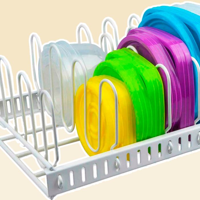 Imagine: No more searching for the right lid. Keep your plastic food containers and lids organized with this adjustable lid rack. The u-shaped dividers can be widened or narrowed as needed to snugly hold all your different-sized containers and matching lids.