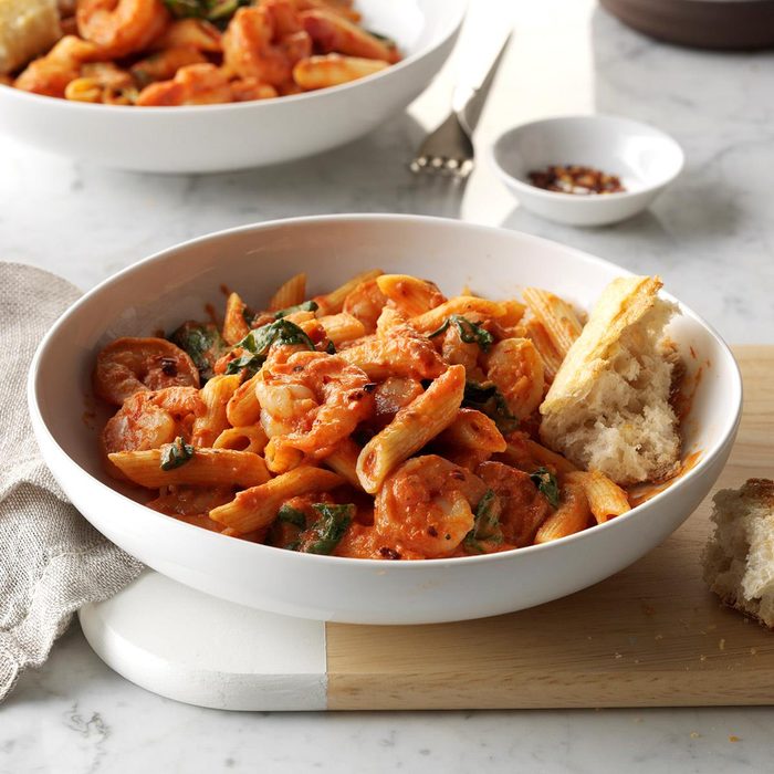 I created this creamy pasta dish when I needed to use up some marinara. Red pepper flakes give it a little heat, which my family loves. It’s super versatile, so try it with chicken, or simply stir in some fresh basil, too. —Lorri Stout, Gaithersburg, Maryland