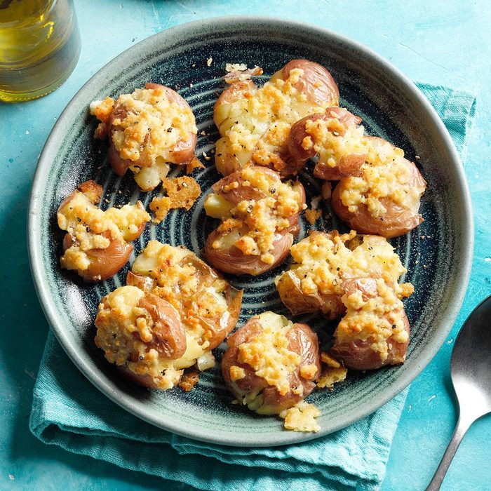 Potatoes are one of our favorite side dishes. These potatoes take a little effort, but you can save time by boiling them ahead of time. The night you want them for dinner, just crisp them up with garlic and Parmesan cheese. —Donna Gribbins, Shelbyville, Kentucky