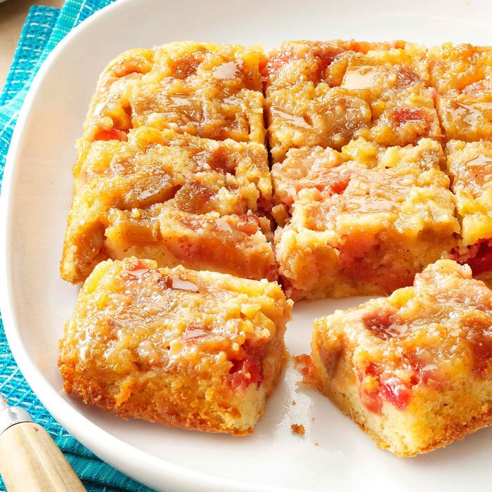Here’s a cake that gets its rosy hue from the rhubarb topping. It’s moist on top and light as a feather on the bottom. —Dawn Lowenstein, Huntingdon Valley, Pennsylvania