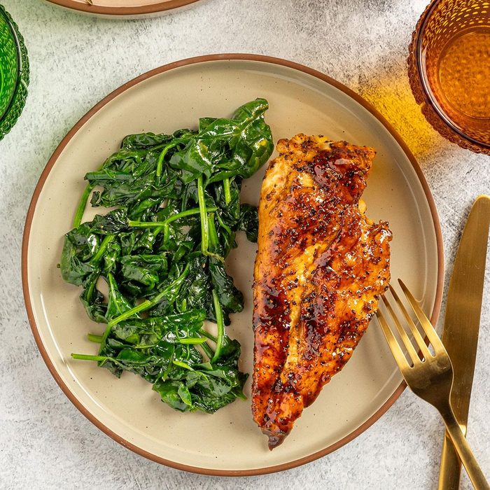 The honey balsamic glaze gives this chicken the perfect caramelization. The recipe calls for chicken breasts, but you could also use thighs or even a whole chicken broken down instead.