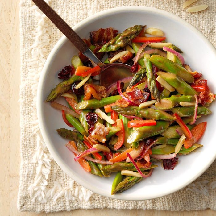 For this asparagus salad, allow enough time to let the flavors blend for at least an hour. That’s one of the secrets to why it tastes so delicious! If you're short on time, use 1/2 cup prepared balsamic vinaigrette instead of making it from scratch. —Dolores Brigham, Inglewood, California