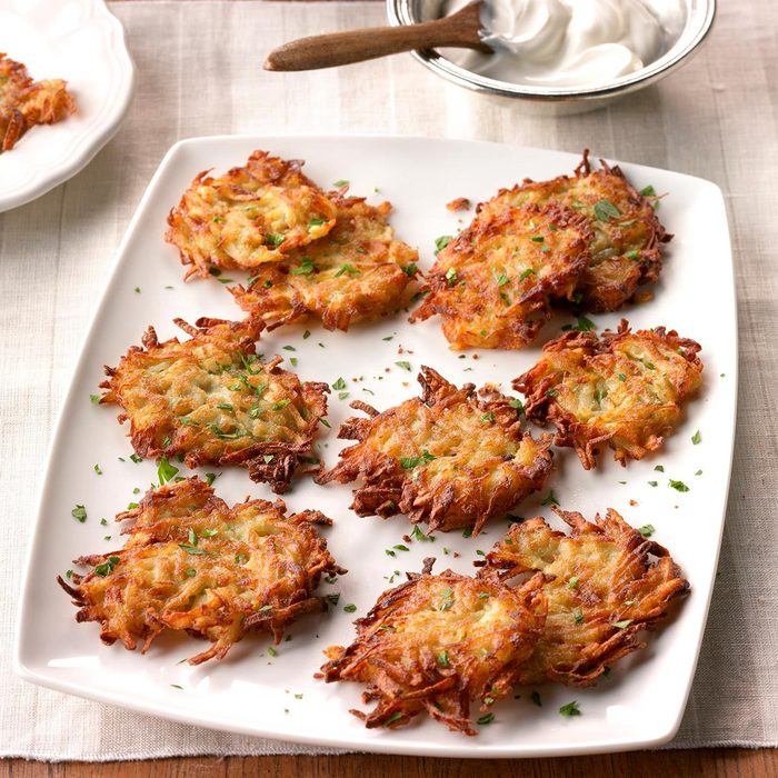These potato pancakes are really versatile. They can be a side dish for just about any meal or the main course for a light meal. Potato pancakes go particularly well with pork. We have them often at our house. —Lydia Robotewskyj, Franklin, Wisconsin