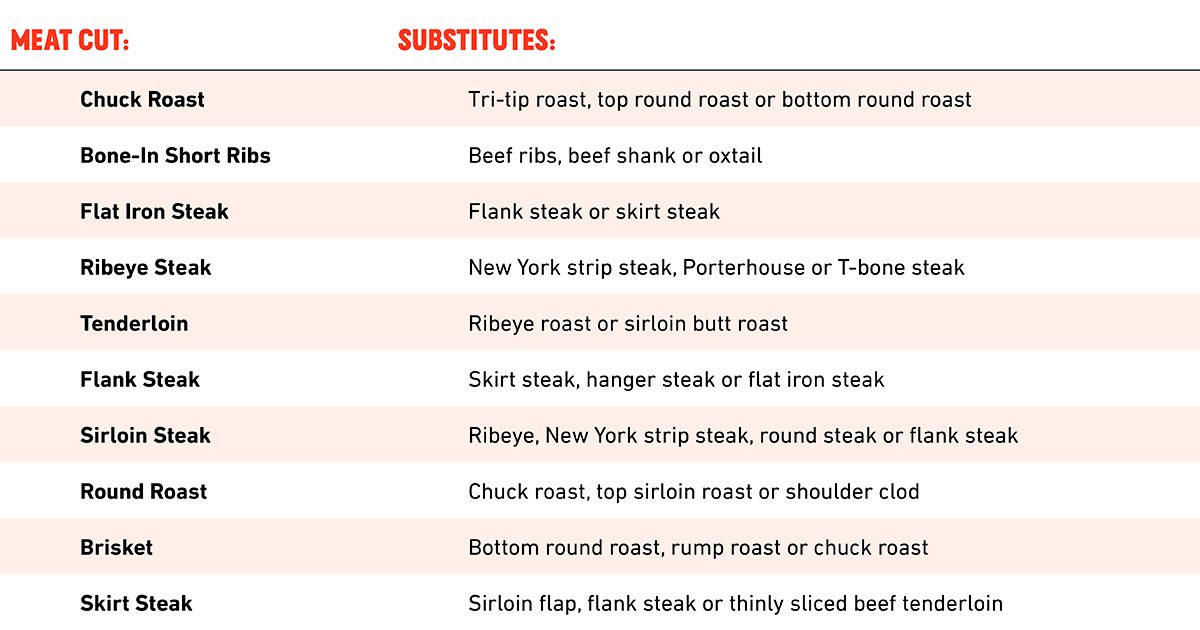 Round Roast Substitutes: This roast might be labeled as top round or bottom round (also called the rump roast). If you can’t find either, chuck roast makes a great swap, although it contains more fat. If you prefer a leaner swap, look to top sirloin roast or shoulder clod.