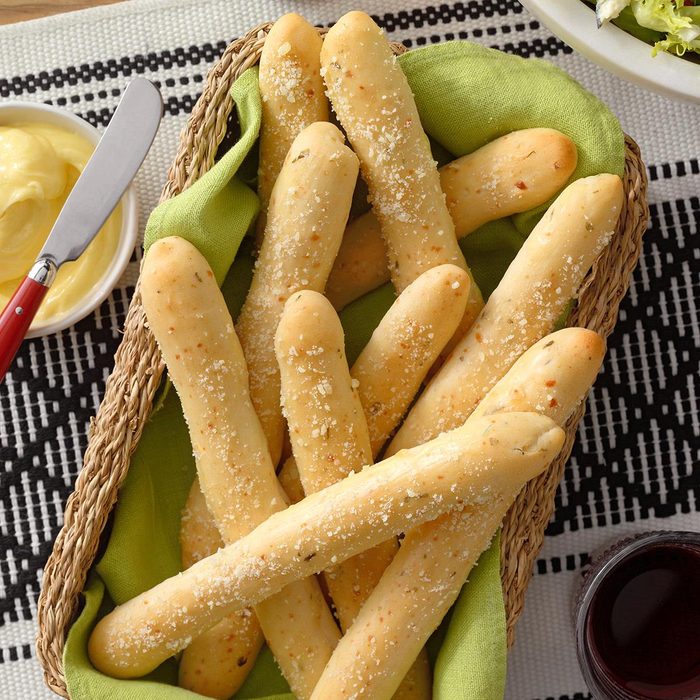 I rely on a bread machine to mix the dough for this buttery garlic breadsticks recipe that is mildly seasoned with garlic and basil. I like to use this dough when making pizza, too. —Charles Smith, Baltic, Connecticut