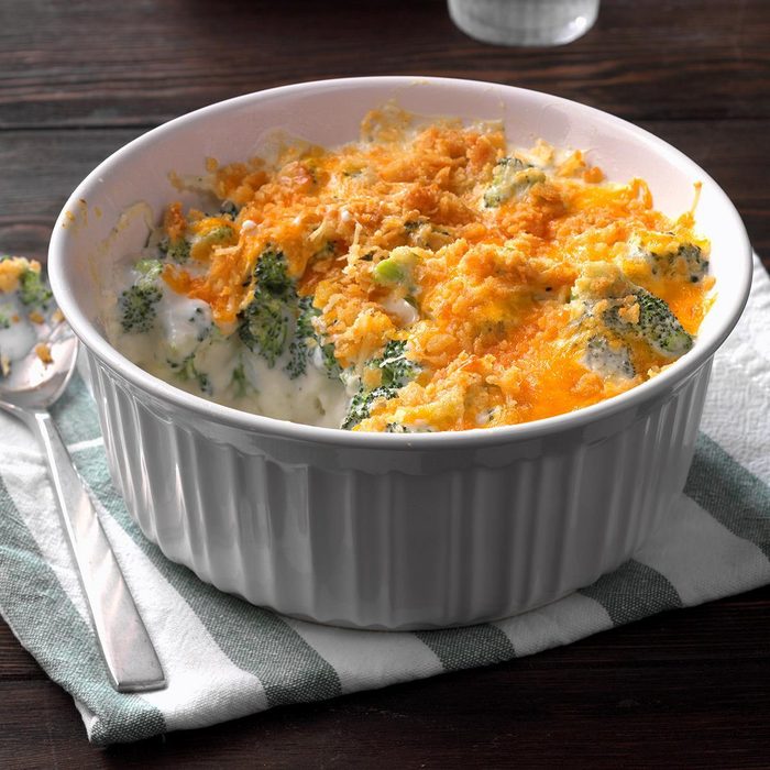 Even people who don’t like broccoli beg me to make this comforting broccoli cheese casserole recipe. It's similar to a classic green bean casserole, but the melted cheese just puts it over the top. —Elaine Hubbard, Pocono Lake, Pennsylvania