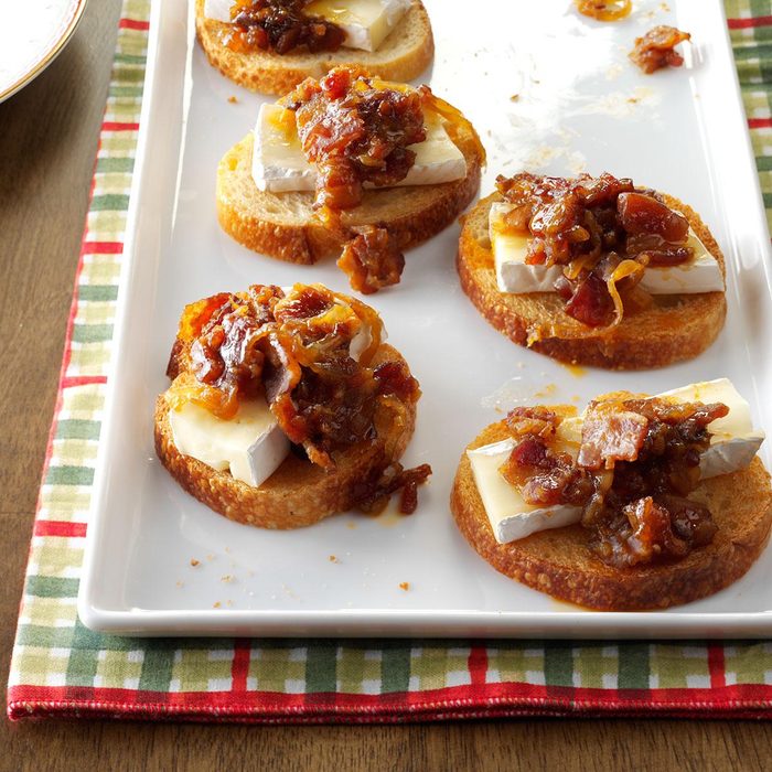 Among my friends, I’m known as the Pork Master because I love to cook just about every cut there is. These appetizers combine soft, mild Brie cheese with a sweet-sour bacon jam that has a touch of Sriracha sauce. —Rick Pascocello, New York, New York