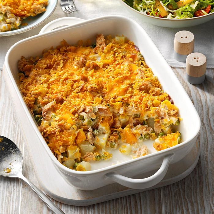 This simple, satisfying casserole comes out of the oven golden brown thanks to a top layer of crunchy cornflakes. The frozen peas add a pop of brightness and color, while the boiled potatoes absorb all that savory salmon flavor. Save the leftover cereal to use with these other cornflake recipes.