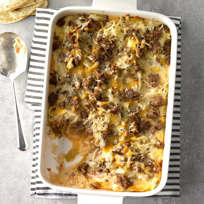 Between family and friends, we average 375 visitors a year! This casserole is super handy—you can put it together the night before and let the flavors blend, then bake it in the morning. —Nancy Schmidt, Center, Colorado
