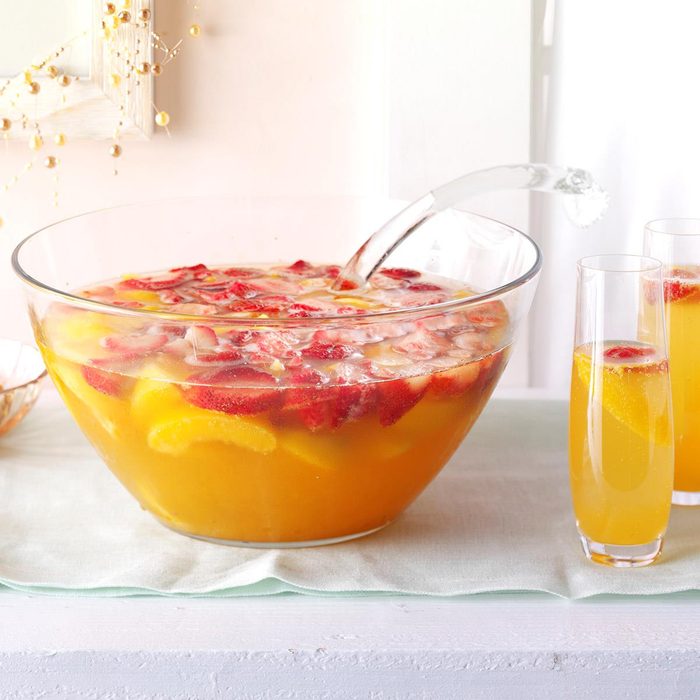 Pro tip: Freeze fresh peaches and strawberries in the summertime and you’ll have them available when the holidays roll around. Then all you have to do is stir in soda, liqueur and champagne before serving.
