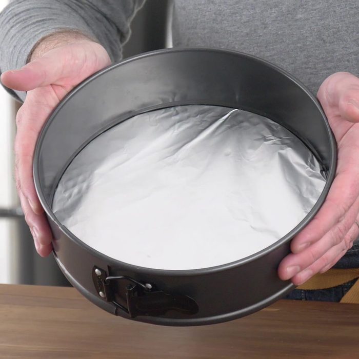 Our Test Kitchen recommends lining the base with a layer of non-stick aluminum foil to help it glide off the pan once ready to serve.