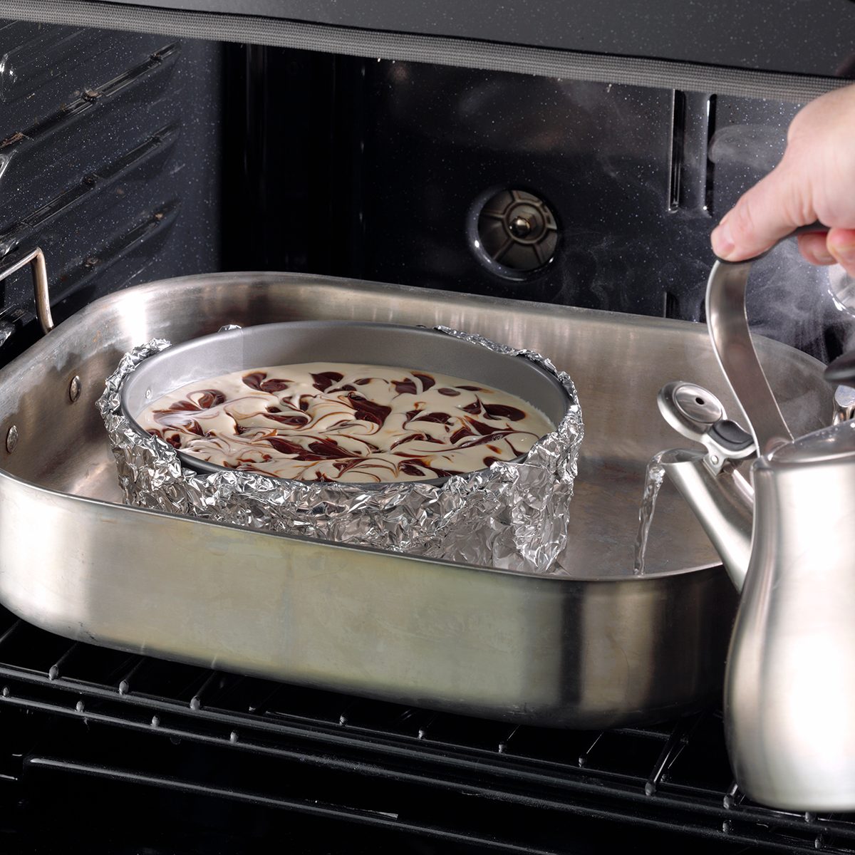 Even if the recipe doesn’t call for it, our Test Kitchen recommends using a water bath to bake cheesecake. Water baths help the cheesecakes bake gently and evenly, plus the steam from the hot water creates a nice humid environment for baking. Humidity while baking will help prevent dreaded cracks.