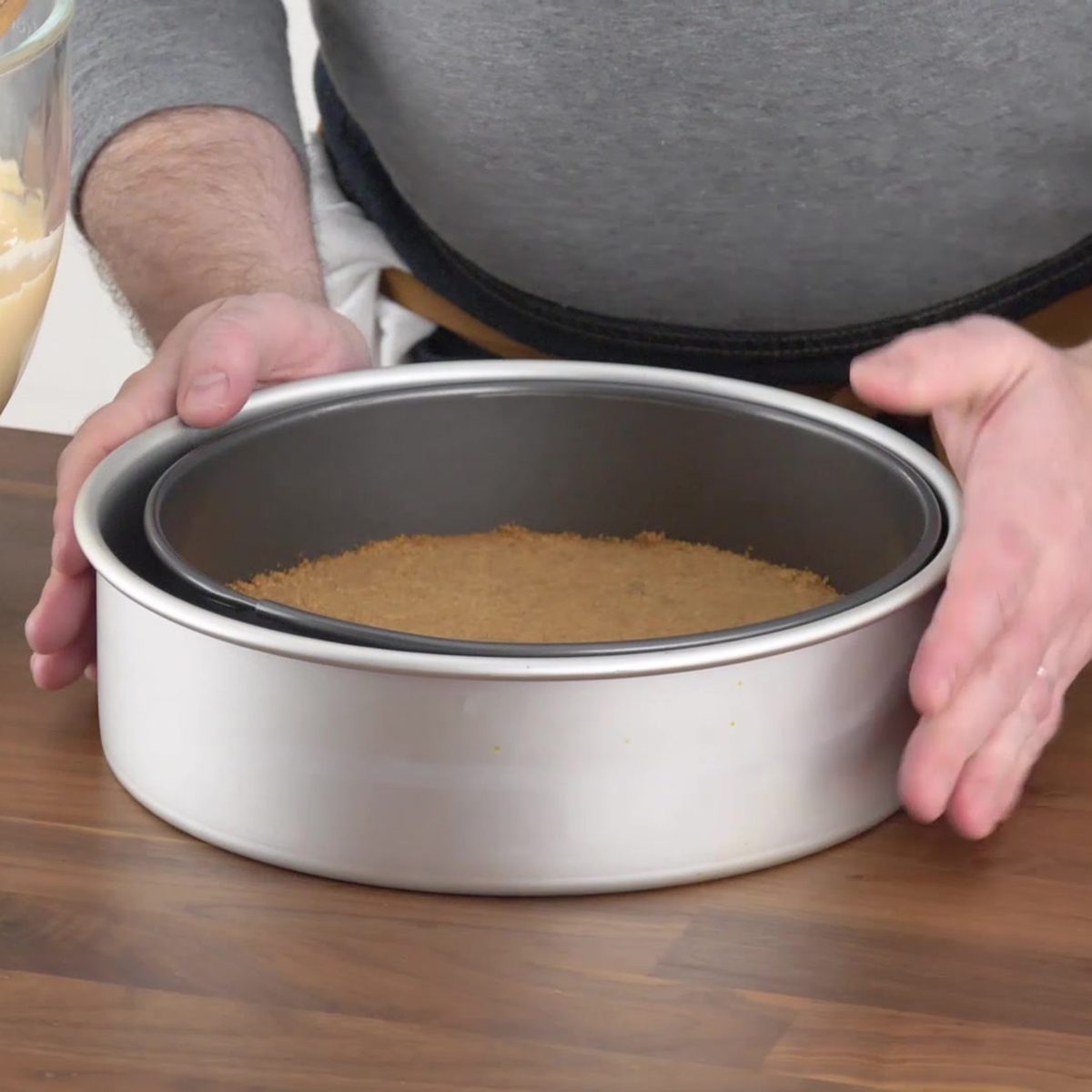 Leaky pans are a cheesecake’s arch-nemesis. For a foolproof way to leak-proof any springform pan, place your springform inside a slightly larger cake pan before placing it in your water bath prior to cooking.