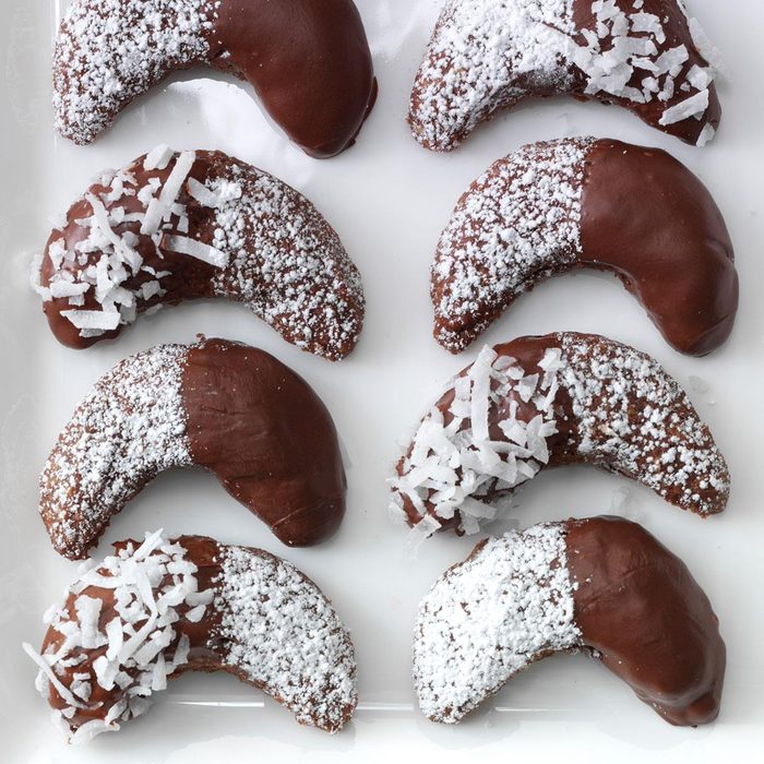 From the Recipe Creator: I use a round cookie cutter to form the crescent shapes for these nutty favorites. They’re so pretty sprinkled with sugar and drizzled with chocolate. —TerryAnn Moore, Vineland, New Jersey