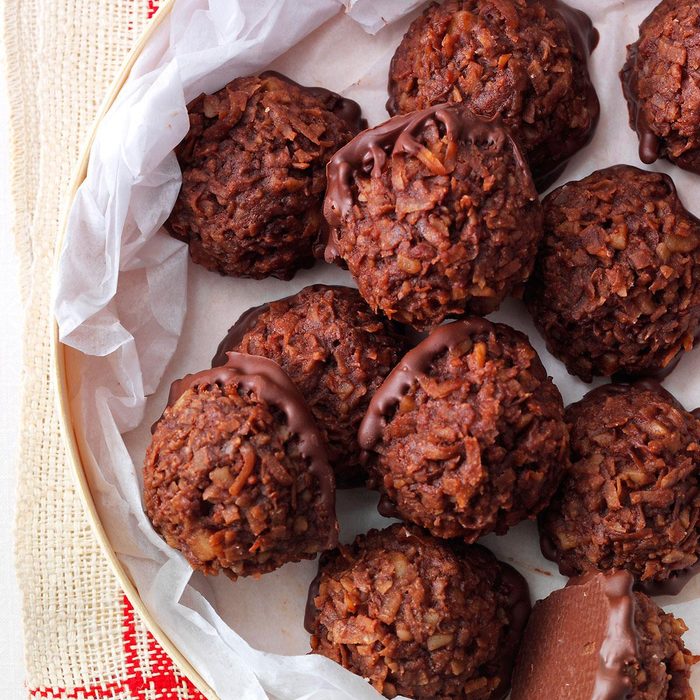 From the Recipe Creator: This perfect macaroon has dark chocolate, chewy coconut and macadamia nuts and is dipped in melted chocolate—sinful and delicious! —Darlene Brenden, Salem, Oregon