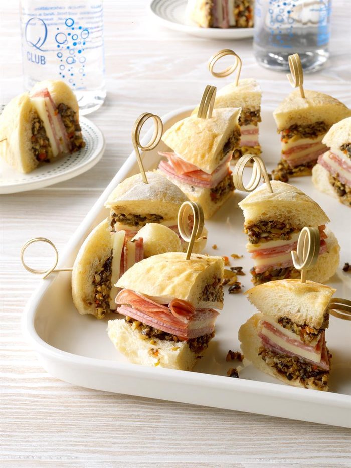 Mediterranean meets comfort food when French rolls are slathered with olive spread and stuffed with layers of salami and cheese. You can make these muffulettas the night before and cut them into appetizer-sized slices just before serving. —Gareth Craner, Minden, Nevada