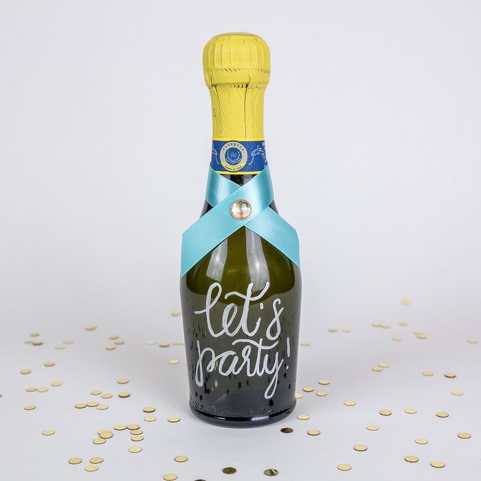 Personalize a bottle of sparkling wine of any size with a cute and festive message (it’s a great excuse to brush up on your hand lettering skills!). Start this project by removing the label from your bottle. The easiest way to get rid of every last bit of adhesive is to soak the bottle—label and all—in warm water and a few tablespoons of baking soda (your kitchen’s secret cleaning ingredient). After 15 minutes, the label will peel right off.