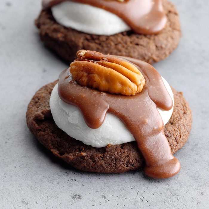 What fun! These double-chocolaty delights have a surprise inside! Atop the chocolate cookie base, marshmallow peeks out under chocolate icing. Kids love them! — June Formanek, Belle Plaine, Iowa
