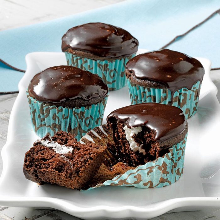 These chocolate cupcakes have a fun filling and shiny chocolate frosting that make them different from any other. They always disappear in a flash! —Kathy Kittell, Lenexa, Kansas