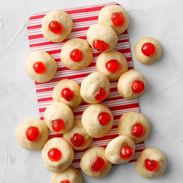 A juicy maraschino cherry is the secret center tucked inside these special cookies. My mom was inspired to create this by a recipe she clipped out of a newspaper more than 30 years ago. —Evy Adams, West Seneca, New York