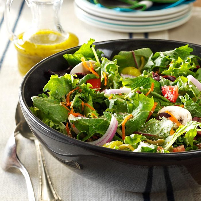 For an Italian twist on salad, I mix greens with red onion, mushrooms, olives, pepperoncini, lemon juice and Italian seasoning. Add tomatoes and carrots if you'd like. —Deborah Loop, Clinton Township, Michigan