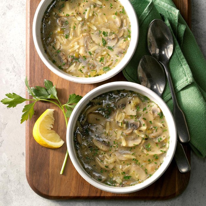 Here’s a versatile soup that works as an appetizer or as a side for a sandwich lunch. It’s loaded with mushrooms and orzo pasta—and lemon livens up its mild flavor.—Edrie O’Brien, Denver, Colorado