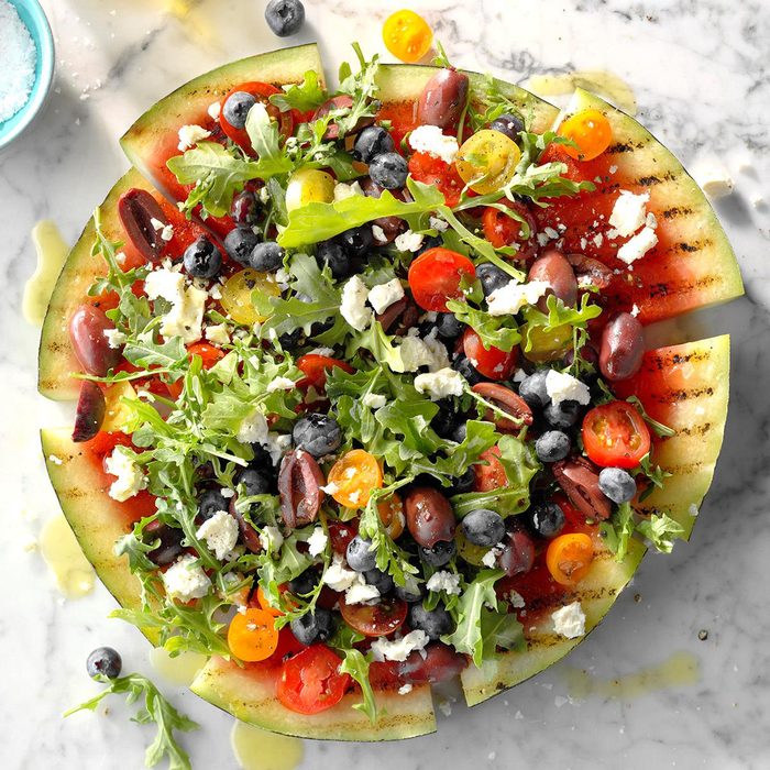 Start with grilled melon slices and layer on the tangy, salty and sweet toppings for a fresh appetizer. —Ellen Riley, Murfreesboro, Tennessee