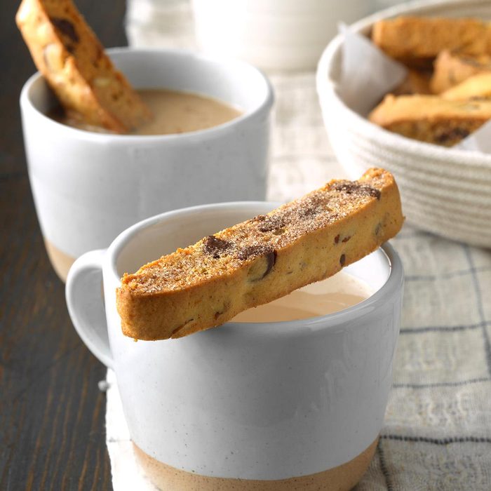 Mandelbrot in Yiddish literally means "almond bread." The twice-baked cookie made with oil and almonds dates back to 19th century Eastern Europe. There are many variations made of different dried fruits and nuts. My chocolate chip version is more modern-American. —Kimberly Scott, Kosciusko, Mississippi