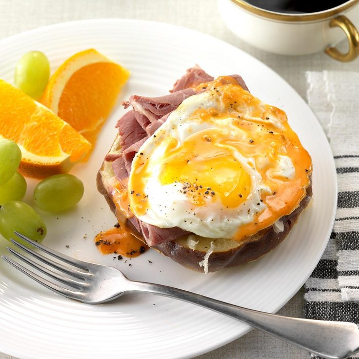 When it comes to food, two of my all-time favorites are Reuben sandwiches and eggs Benedict. So naturally I combined them into this incredible breakfast dish. I serve mine with bacon on the side, but hash browns and fresh fruit go great, too! —Jessica Rehs, Akron, Ohio