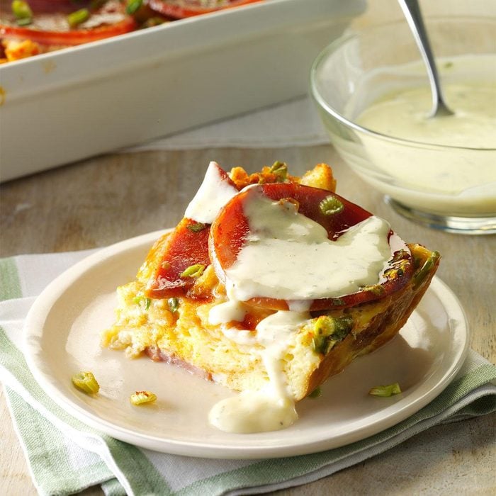 When I was growing up, we had a family tradition of having eggs Benedict with champagne and orange juice for our Christmas breakfast. But now that I’m cooking, a fussy breakfast isn’t my style. I wanted to come up with a dish I could make ahead that would mimic the flavors of traditional eggs Benedict and would also freeze well. Friends, all I can say is, this one fits the bill! —Lyndsay Wells, Ladysmith, British Columbia