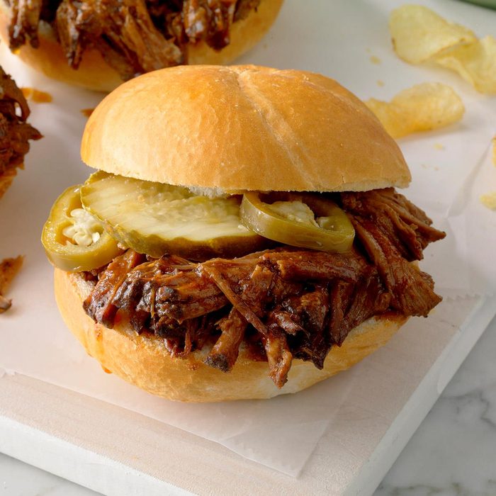 Chuck roast makes delicious shredded beef sandwiches after simmering in a rich, homemade sauce all day. The meat is tender and juicy and takes minutes to prepare for a weeknight dinner or potluck. —Tatina Smith, San Angelo, Texas