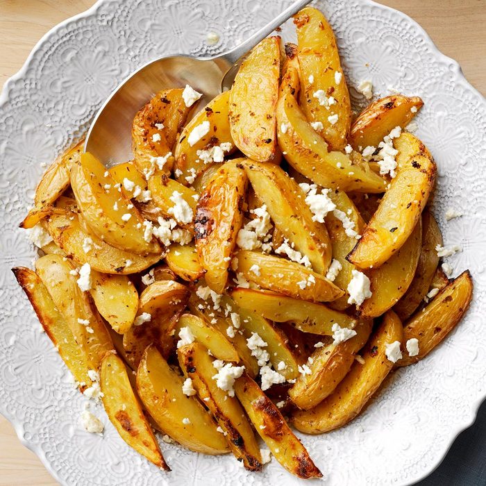 Feta makes everything better, and buttery roasted potatoes are no exception. If you can’t find dried oregano, a dried Italian seasoning works great too.