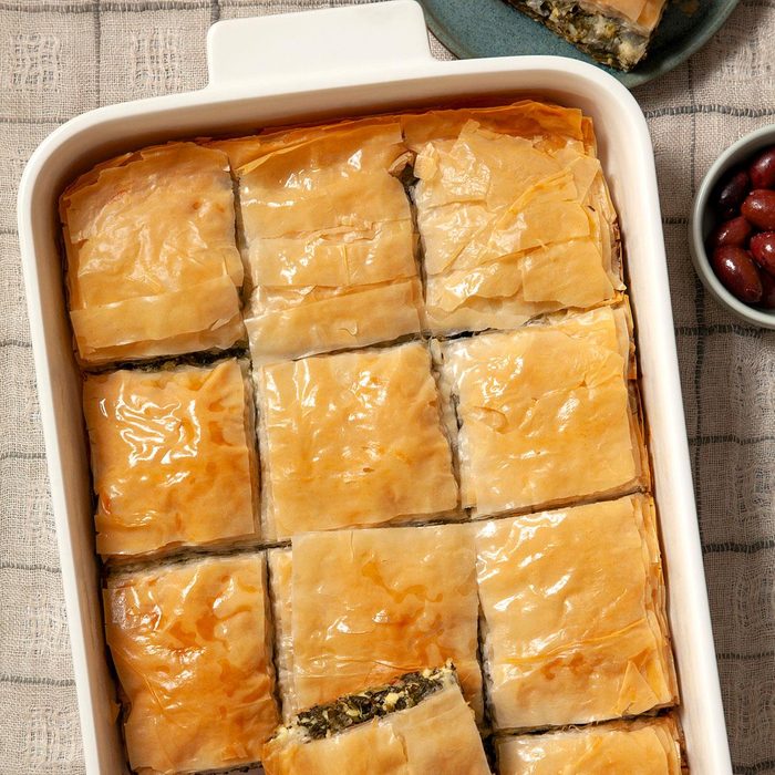 A cheat code to add more spinach to your diet, Spanakopita features a seasoned mix of the leafy green and feta cheese stuffed between layers of crispy and flaky phyllo pastry.