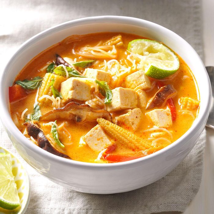 My go-to Thai restaurant inspired this curry soup. Shiitake mushrooms are my favorite, but any fresh mushroom will work. Fresh basil and lime add a burst of bright flavors. —Tre Balchowsky, Sausalito, California. If you enjoyed this recipe, then you must try Thai basil chicken.