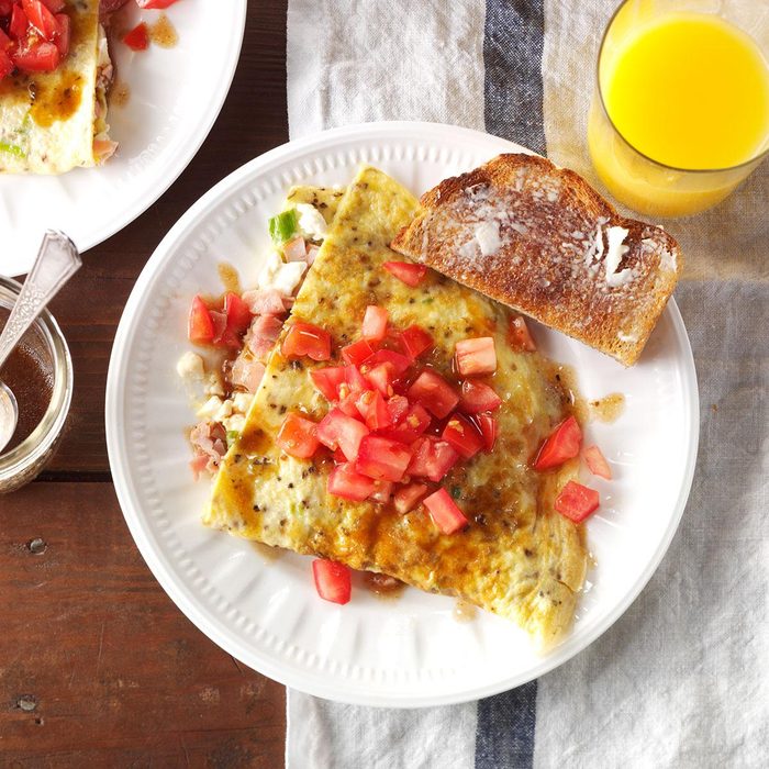 Any excuse to have feta cheese and balsamic vinaigrette is a good one! We pile this Mediterranean-inspired omelet with tomatoes for a great get-started breakfast. —Brittany Beus, College Station, Texas
