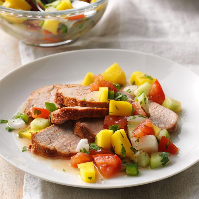 3 ounces cooked pork with 1/3 cup relish: 171 calories, 4g fat (1g saturated fat), 63mg cholesterol, 245mg sodium, 9g carbohydrate (7g sugars, 2g fiber), 23g protein. Diabetic Exchanges: 3 lean meat, 1/2 starch.