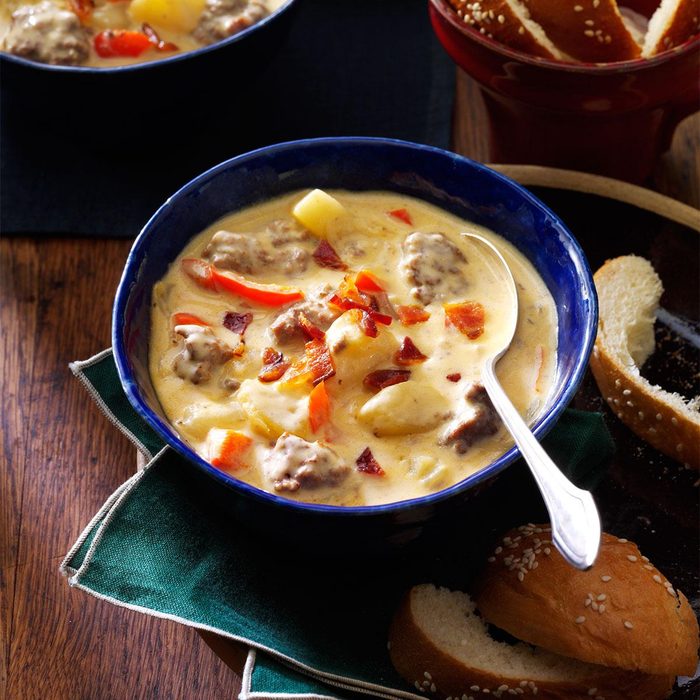 The taste of a good bacon cheeseburger is hard to beat until you try this cheeseburger chowder! It's hearty, convenient and family-friendly. —Kristin Stone, Little Elm, Texas