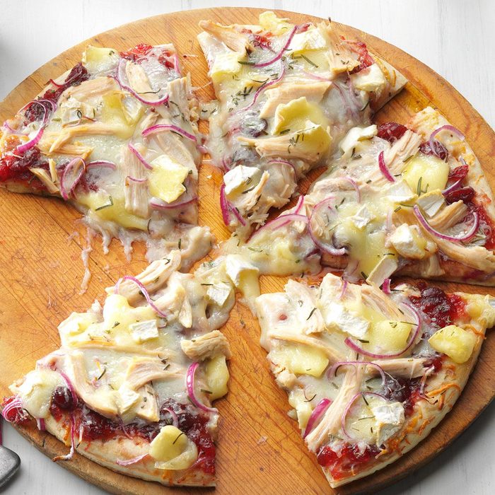 While traveling in New Zealand, my husband and I discovered turkey pizza. We came up with our own version for a creative way to use leftovers. —Kristin Stone, Little Elm, Texas