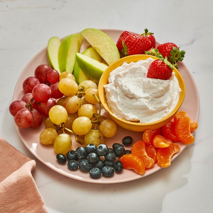 A vibrant fruit tray with a homemade marshmallow fruit dip offers something a little lighter. Feel free to use all pink and red fruits to fit the theme, like strawberries, raspberries, cherries, figs and Pink Lady apples.