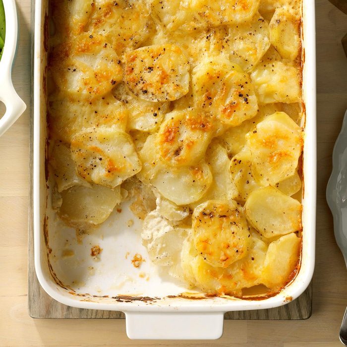 My husband found this recipe when I called and informed him we were going to have guests for dinner. This tasty variation on traditional scalloped potatoes is dressed up with garlic, Swiss cheese and Parmesan cheese.