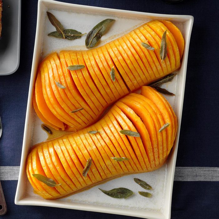 Squash makes the perfect holiday side dish, especially when it's Hasselback butternut squash! The thin slits cut into each half allow the butter, maple syrup, brown sugar and ground chipotle mixture to get in every single nook and cranny. This is one side that everyone at your holiday table will be excited to gobble up! —Colleen Delawder, Herndon, Virginia