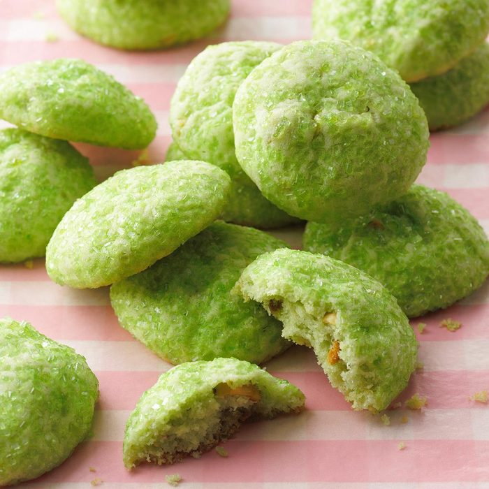 In need of a bite-sized green dessert? These extra-tender cookies fit the bill. The recipe uses pistachio pudding mix, almond extract and toasted pecans for three times the nutty flavor.