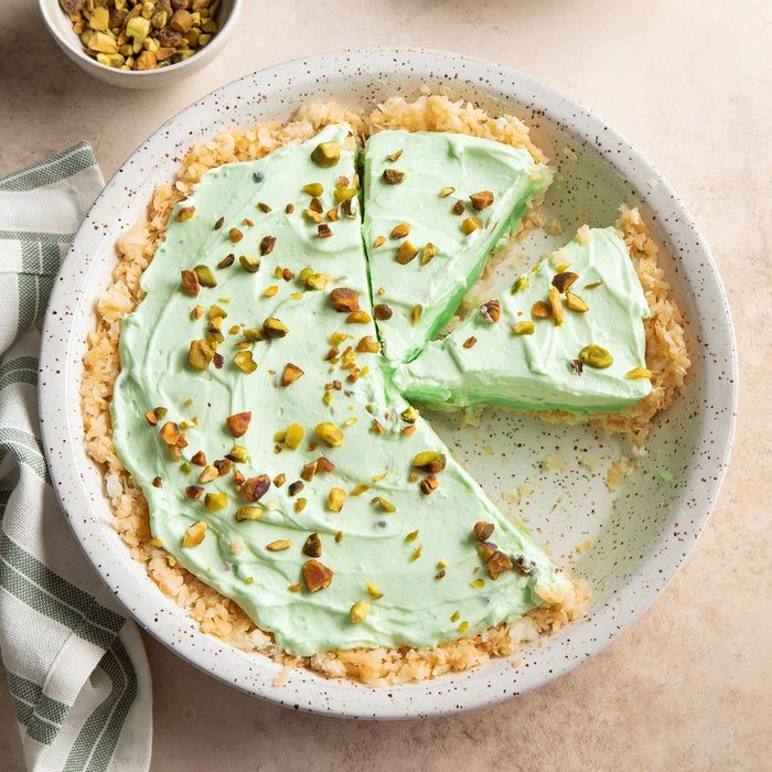 Fans of the retro grasshopper cocktail will undoubtedly love the dessert version: grasshopper pie. The best part? It’s not nearly as complicated to make as it looks. A premade chocolate-crumb crust and store-bought chocolate-covered mint cookies save you a ton of time in the kitchen. Any leftovers can be popped back in the freezer for up to a week.