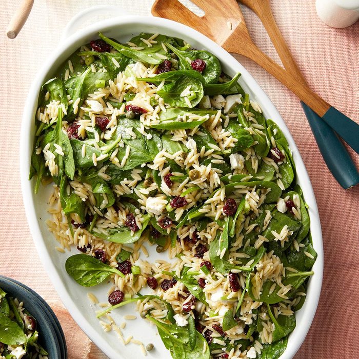 Part salad, part side, this well-balanced dish combines tart cranberries, toothsome orzo and spinach leaves in a citrus dressing with capers and crumbly feta. Pair it with grilled chicken or fish, and dinner is done. Bonus points for sneaking in some extra greens and vitamins at the same time.