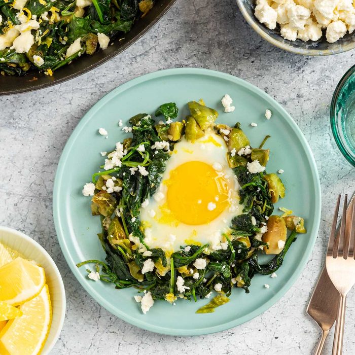 Not a fan of corned beef and hash? Swap the traditional Irish breakfast for something a little more green—and lean—with this superfood-packed shakshuka. Made with four types of greens (Brussels sprouts, kale, baby spinach and parsley), garlic, eggs and feta, this dish will power your day until it’s time for happy hour and a green beer.