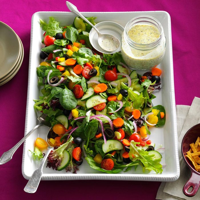 Celebrate your Easter meal with this colorful salad loaded with fresh spring vegetables. It’s colorful and crunchy, and it has a satisfying salty kick with the addition of green olives. While you can use any salad dressing you like, the pesto buttermilk dressing adds a perfectly creamy, herbed finish.